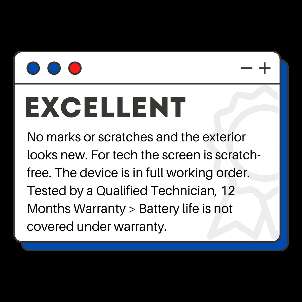 No marks or scratches and the exterior looks new. For tech the screen is scratch-free. The device is in full working order. Tested by a Qualified Technician, 12 Months Warranty > Battery life is not covered under warranty