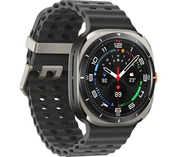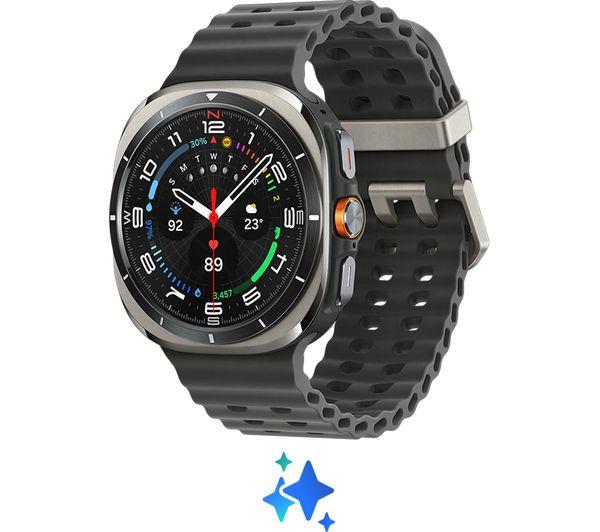 What's Included- Features- Get off the beaten track with this Samsung Galaxy Watch Ultra. Its rugged titanium casing is tested to military standards to withstand extreme temperature, altitude and pressure. Perfect if you're drawn to adventure. Should the worst happen, it's even packing an emergency siren that can be heard up to 180 metres away. Let's hope you never need it though! Its next-gen BioActiveSensor detects the smallest of changes to your heart rate, so it logs your every move and sleep cycle accurately. And its Galaxy AI-powered Energy Score compiles all of your data into one easy-to-understand number. It then suggests ways to improve your health so you can smash your fitness goals in style.