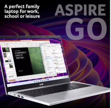 What's included: Features: The new Aspire Go 15 from Acer is a great all-round laptop, easily capable of meeting your day-to-day needs. Featuring an Intel N200 CPU and 8GB of RAM, the Aspire Go can easily handle a wide range of day-to-day tasks, such as web browsing and editing documents. It also come with a 256GB SSD to store all your apps & files. The large 15.6-inch display features a Full HD resolution for plenty of sharp detail – great for streaming movies. The screen is also equipped with Acer's BlueLightShield technology to help reduce eye strain and fatigue. Copilot Key - The Aspire Go 15 features the brand new Microsoft Copilot key on its keyboard, giving you instant access to Microsoft's AI-powered assistant. Better for the Environment - The Aspire Go 15 is designed to be kinder to the planet, with recycled plastic used in the chassis and 100% recyclable packaging. Model number: AG15-31P. Part number: NX. KRPEK.00C. General features: CPU, Memory and Operating System: Display features: Graphics: Interfaces and connectivity: Multimedia features: