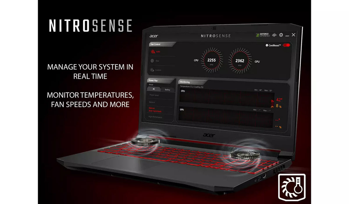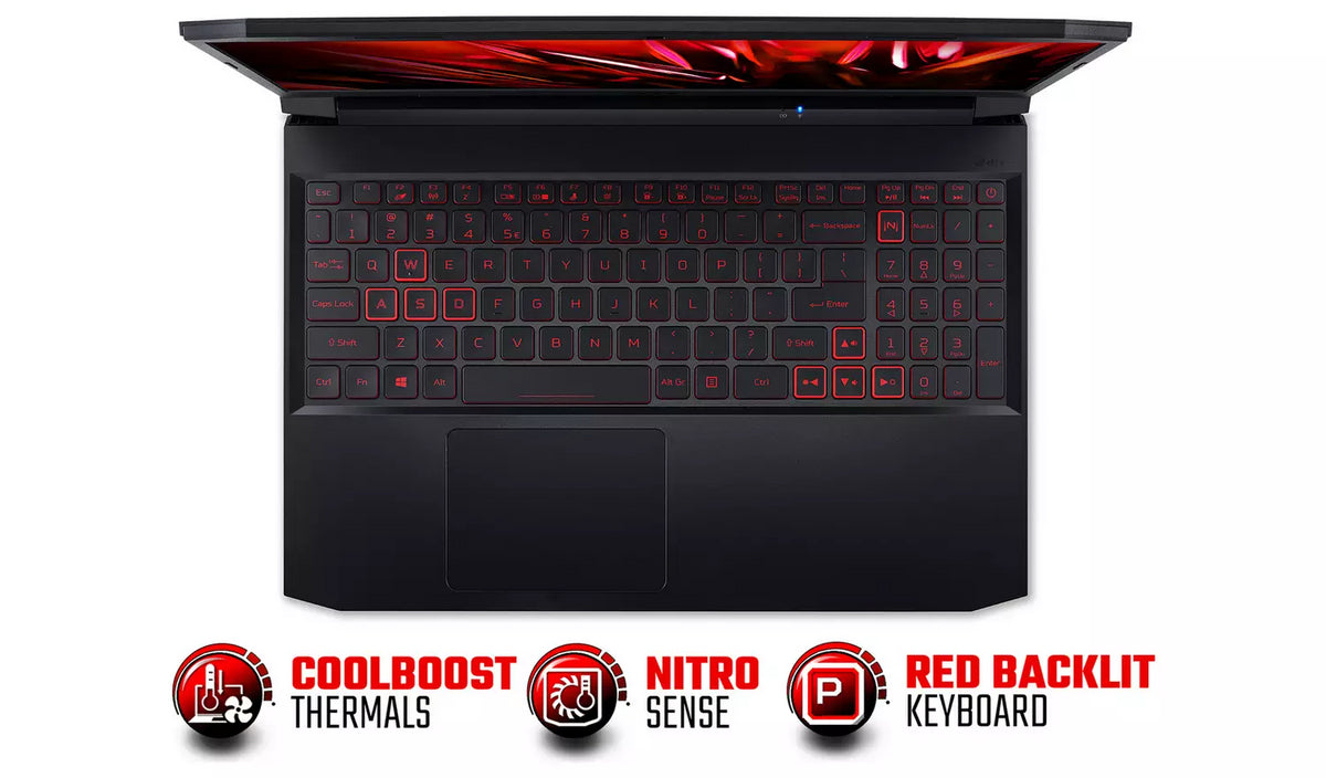 What's included: Features: Equipped with an Intel Core i5-11400H CPU and 8GB of RAM, plus a 512GB SSD to store all your games, the Acer Nitro 5 gaming laptop lets you reign over the gaming world. Coupled with the NVIDIA GeForce RTX 3050Ti GPU, you get plenty of performance to play all your favourite games, which will look stunning on the 15.6-inch 144Hz Full HD IPS screen. To keep your Nitro 5 running cool, it features dual cooling fans, quad exhausts and Acer's CoolBoost technology which automatically increases fan speeds by up to an extra 10% when you need it most. The NitroSense control centre allows you to monitor temperatures & fan speeds, adjust RGB lighting effects, power profiles, fan speeds and more - all with a single press of the dedicated NitroSense keyboard key. Equipped with dual cooling fans and 4 exhaust ports, the Nitro 5 can stay cool during extended gaming sessions - plus CoolBoost can increase fan speeds an extra 10%, for when you need to push things that little bit harder.