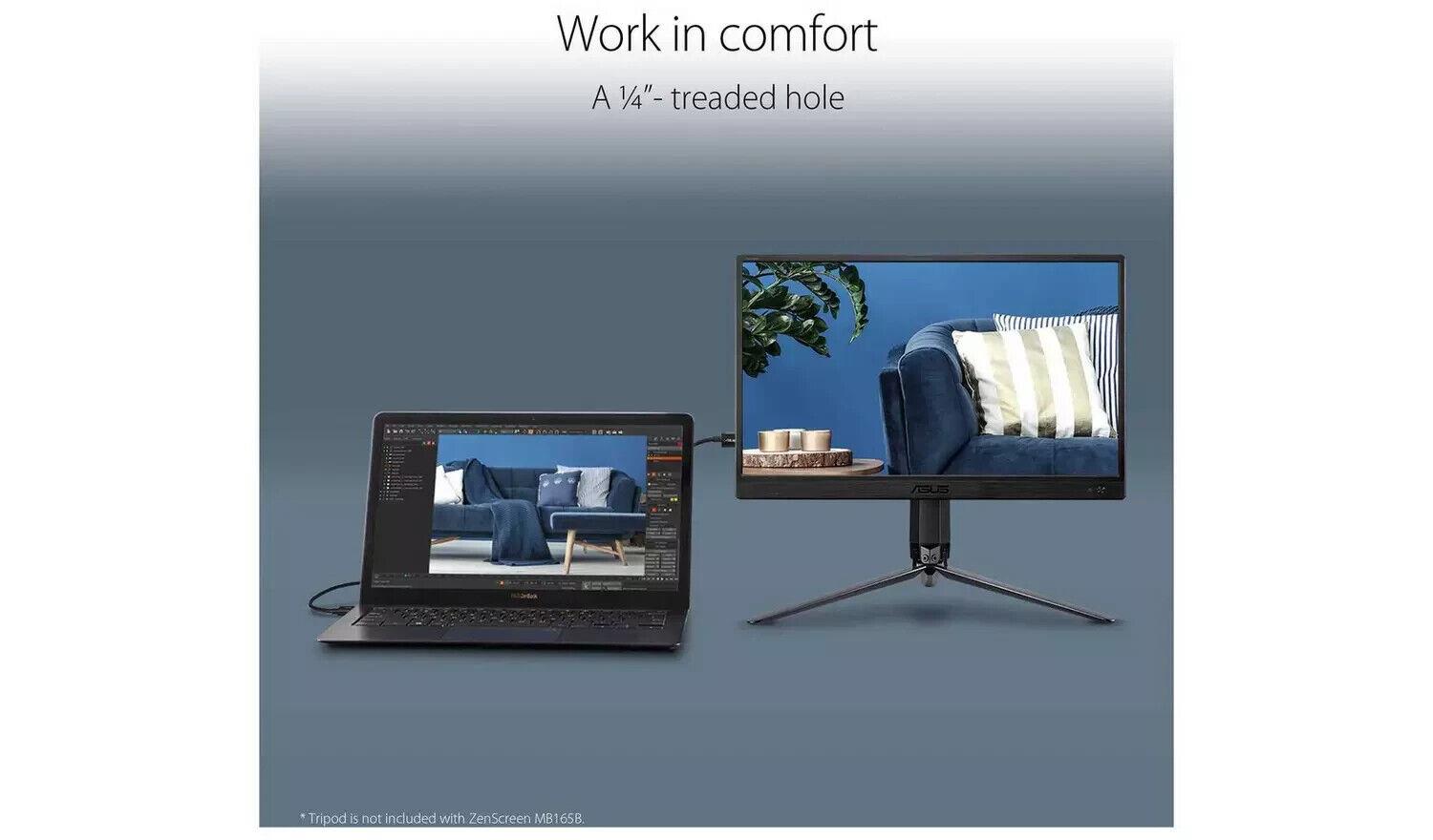 A ¼”-threaded hole at the rear of the monitor lets you to attach ZenScreen MB165B to a conventional tripod or table-mount easily.